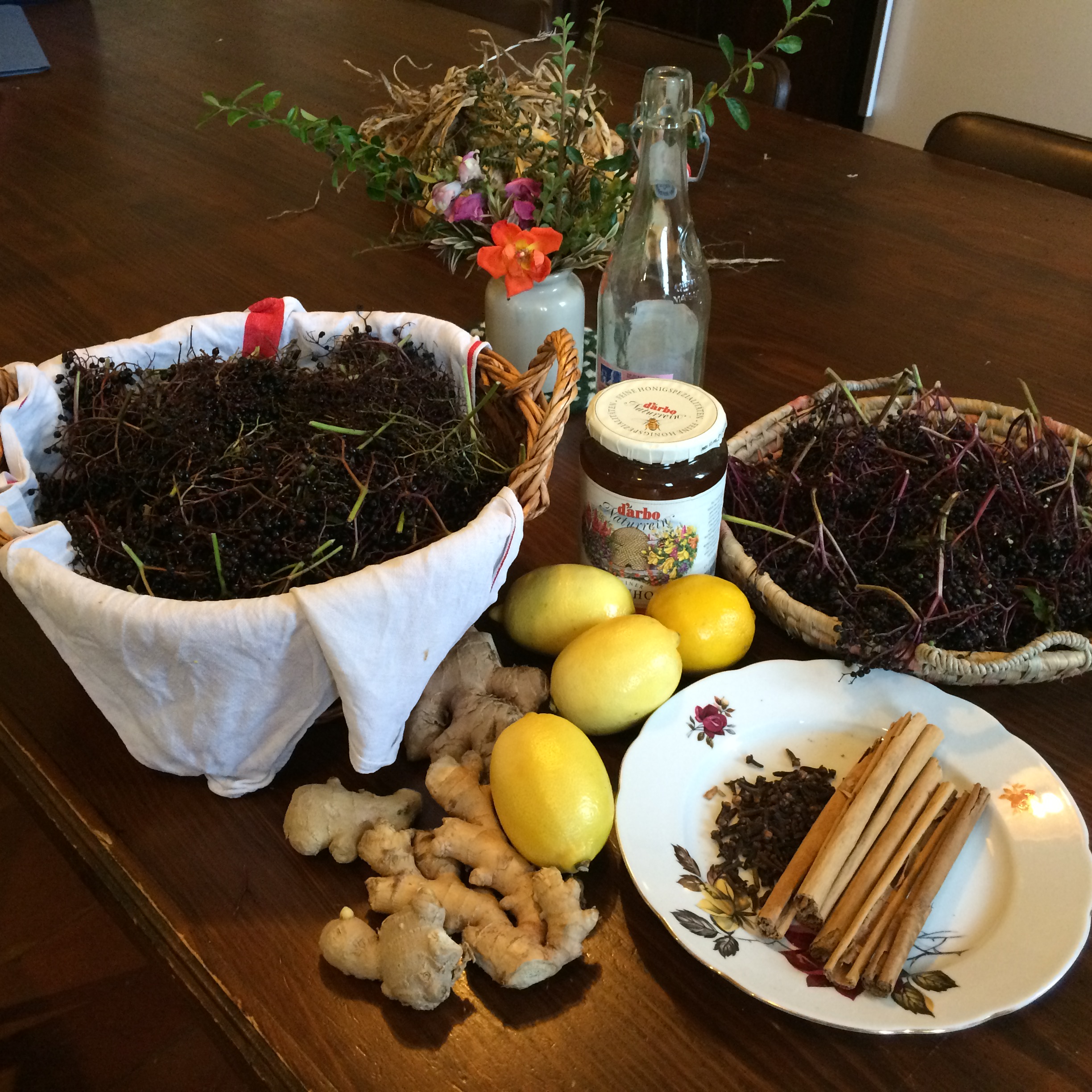 Onward to the wonders of making this magic elixir. It’s quite easy. It just takes a while from start to finish and your presence with the process. It doesn’t make sense to make a small amount of this stuff. First of all, it’s so delicious that you will want to drink it like juice, secondly, it takes hours to collect enough berries to make a goodly amount, thirdly it costs a lot of money in the stores for what you can make at home. Now, if you factor in the time harvesting, the wild-crafted honey I purchased, the fresh lemons, cinnamon sticks, cloves and organic ginger, and I was actually charging for my efforts, the cost of what I brewed up would be similar to what you would pay in the stores. Luckily, for the folks, here at this hermitage, they get it for free.